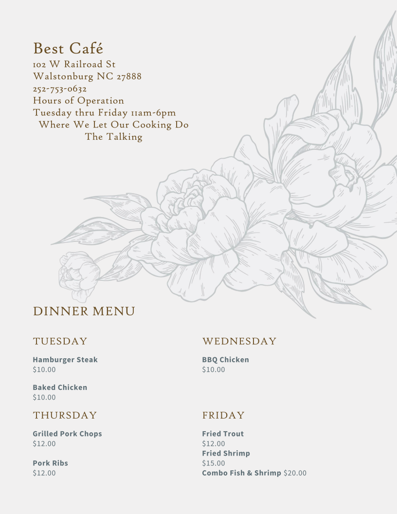 The daily specials at Best Café add a unique touch to the menu. On Tuesdays, you can enjoy a delicious Hamburger Steak or Baked Chicken, while Wednesdays bring BBQ Chicken, cooked to perfection with smoky, tender flavors. Fridays are a real treat with Fried Trout and Fried Shrimp, or you can opt for the Combo Fish & Shrimp for a delightful combination of both. These specials highlight the café’s dedication to offering fresh, flavorful meals that keep customers coming back.